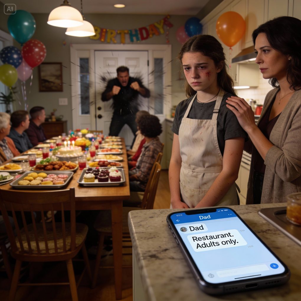 My 17-year-old daughter spent three days cooking for 23 people for my mom’s birthday. Then my dad texted, cold and final: “We decided to celebrate at a restaurant. Adults only.” I didn’t yell. I watched my daughter stand there, hands shaking, eyes empty. I told her, “It’s okay.” Fifteen hours later, the door began to shake—and I realized this wasn’t over. Not even close.
